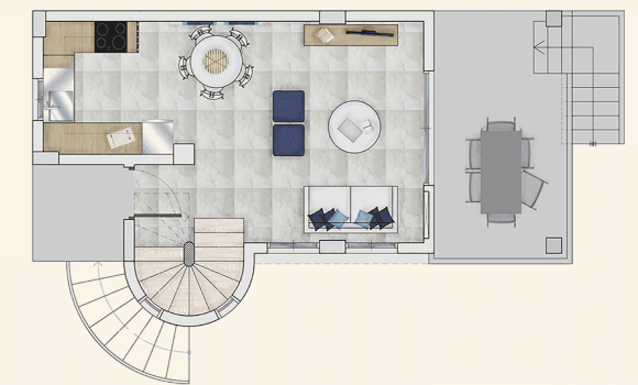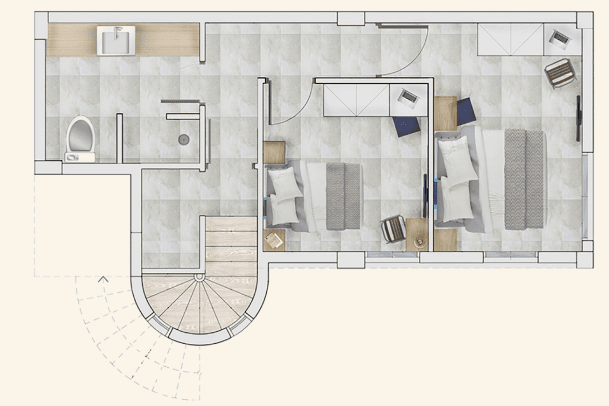 THE GROUND FLOOR layout consists of an opened plan kitchen, dining and living area leading onto cozy terrace, organized as outdoor dining area. High sophisticated kitchen equipment will match the requirements of most demanded cookers, fireplace and SMART TV 43″ will complement the environment in the evenings or during rare rainy or cool days.